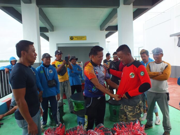 TARAKAN – Kepala Kantor Unit Penyelenggara Pelabuhan Kelas III Sungai Nyamuk, Syaharuddin S.E,SH.,M.H bersama ketua TKBM Pelabuhan Sebatik M. Japar,membagikan baju baru kerja secara gratis yang bersumber dari Koperasi TKBM Pelabuhan Sebatik sebanyak 65 pieces, JUmat (21/07/2023).