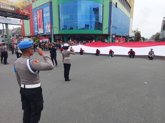 TARAKAN – Warga Tarakan nampak antusias menghadiri penghormatan bendera Merah Putih yang dibentangkan di perempatan Grand Tarakan Mall (GTM) tepat pukul 11.17 Wita, Kamis (17/8).
