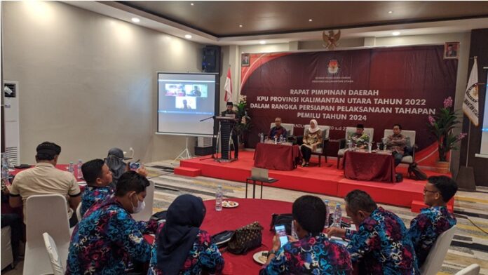 TANJUNG SELOR – Tahapan Pemilu 2024 sudah ditetapkan KPU RI, yang dijadwalkan dimulai pada bulan ini. Menindaklanjuti hal tersebut, Komisi Pemilihan Umum (KPU) Kaltara bersama KPU Kabupaten/Kota melaksanakan Rapat Koordinasi Daerah (Rakorda).
