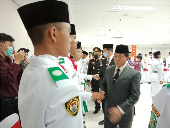 TANJUNG SELOR – Pasukan Pengibar Bendera (Paskibra) Kaltara yang bertugas pada upacara peringatan Hari Kemerdekaan ke 77 RI, dikukuhkan Gubernur Kalimantan Utara (Kaltara) Zainal Arifin Paliwang, di Gedung Gadis, Senin (15/8) malam.