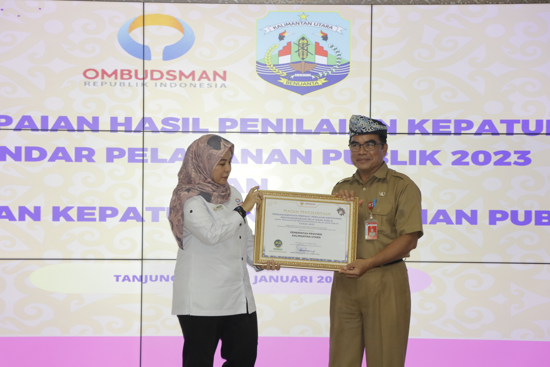 Kalimantan Utara menerima hasil penilaian kepatuhan standar pelayanan publik tahun 2023 oleh Ombudsman RI. Adapun hasil nilai kepatuhan pelayanan publik Kaltara adalah 89,23 dengan predikat A, Kabupaten Bulungan 94,67 predikat A, Kota Tarakan 90,53 predikat A, Kabupaten Tana Tidung 89,34 predikat A, Kabupaten Malinau 88,87 predikat A, dan nilai kepatuhan pelayanan publik Kabupaten Nunukan 87,18 dengan predikat B.