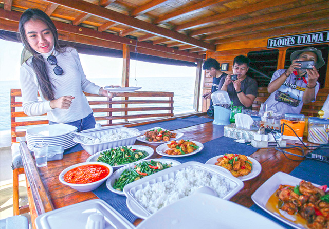 Setidaknya, hidangan makanan yang disajikan chef kapal pinisi Flores Utama Indah (FUI) Muhammad Budiharto membuat saya dan para peserta semakin betah. Betapa tidak, snorkeling cukup menguras tenaga dan membuat perut menjadi keroncongan. Selama tiga hari mengapung di laut, tanpa dikomando, seluruh peserta bergegas merapat ke meja makan.