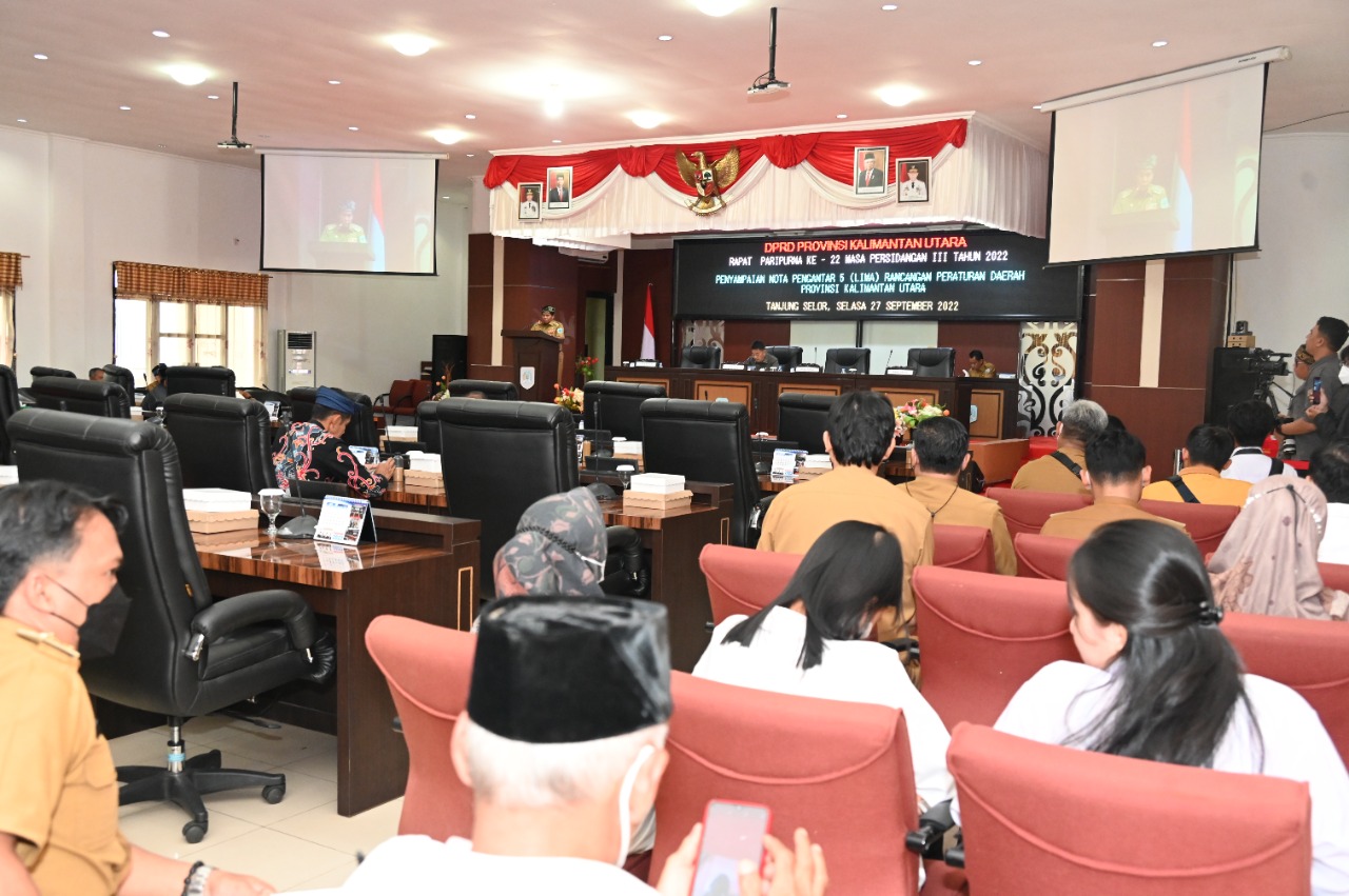 Kelima raperda tersebut meliputi, Raperda tentang Perubahan Atas Peraturan Daerah Provinsi Kalimantan Utara Nomor 03 Tahun 2018 tentang Penyelenggaraan Pelayanan Terpadu Satu Pintu. Raperda tentang Perubahan Atas Peraturan Daerah Provinsi Kalimantan Utara Nomor 20 Tahun 2019 tentang Penyertaan Modal Pemerintah Daerah pada Perseroan Terbatas Migas Kaltara Jaya.