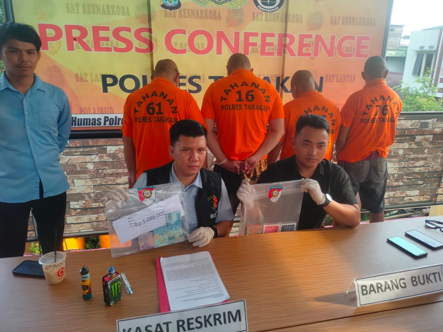 Empat orang masing-masing berinisial HE (55), BU (41), JA (50) dan DI (44) kini ditetapkan sebagai tersangka. Kapolres Tarakan, AKBP Ronaldo Maradona T.P.P Siregar melalui Kasat Reskrim AKP Randhya Sakthika Putra mengatakan, awal pengungkapan atas laporan masyarakat yang mengeluhkan adanya aksi perjudian dan lalu lalang keluar masuk orang. Sehingga mengganggu aktivitas masyarakat.