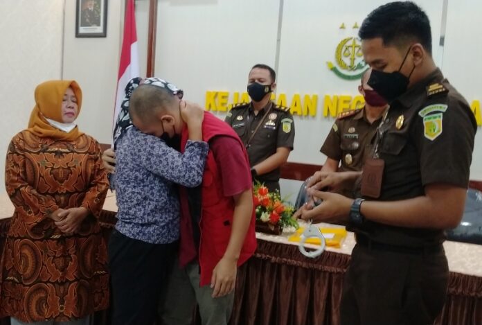TARAKAN – Isak tangis tersangka dan korban tidak terbendung saat dilakukan restorative justice di kantor Kejaksaan Negeri Tarakan, Kamis (14/4). Tersangka, Ahmad Syafaruddin telah melakukan tindak pidana pencurian satu unit handphone.