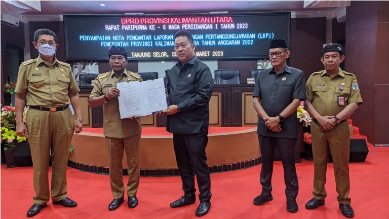TANJUNG SELOR – Dewan Perwakilan Rakyat Daerah (DPRD) Kalimantan Utara (Kaltara) menerima Laporan Keterangan Pertanggungjawaban (LKPj) Pemerintah Provinsi (Pemprov) Kaltara Tahun Anggaran 2022.